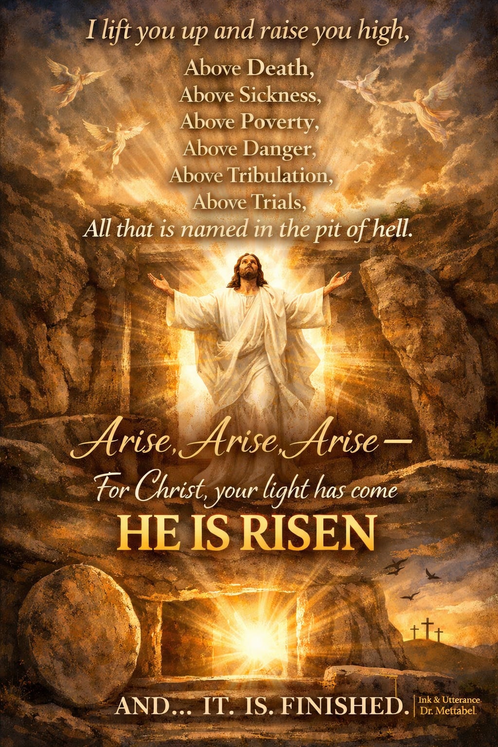 I give credence to the pain you’ve been through, But TODAY I stretch forth my hand And I say Come. For silver and gold had I not, But all that I now have, I give to you. To see you leap for joy once more, To see you praise, and dance, and laugh. I have been in the dark with you. That impotent place I know so well — ‘Land of despair, land of the dead’. I lay in the silence, bound by chords of my love for you. Wrapped in linen, in cold stone sealed. When they thought that hope had been nailed and killed. Still, I lay, for the enemy to think that he won. Still I lay, Waiting I lay, as I bore the weight Of every sin, Of every sorrow, Every pain, Every cry. Not watching from some distant sky. I descended to hell, I went to Sheol. Loosing every power, every chain. Death thought it held the final answer. It did not know that I AM He. I wrestled and won, fought and prevailed, With power today, I call you COME FORTH! The time of death is passed, And surely you shall live again. For with the morning comes the turning. The Sun of Righteousness rising, With great healing in His wings. To flood you with light and love and LIFE, My redeemed, for whom great price I paid. You shall return — sorrow and sighing fleeing away. You shall arise; you shall alight. Beauty for your ashes, The oil of joy where mourning held its throne. I have called you by your name — You. Are. Mine. Though you thought yourself forsaken, With my “It is finished” in death, Your “life” gloriously begins. So I lift you up and raise you high, Above death, Above sickness, Above poverty, Above danger, Above tribulation, Above trials, Above all that is named in the pit of hell. So get up, arise, and shine — You, son of the promise, daughter of light, arise! Mount up — yes, mount up! Running and not weary, walking and not faint. Oh! Forever on eagles’ wings YOU FLY!!! Your youth renewed, your strength restored — Though you were forsaken, Though you were abandoned, Though you were dead, Yet shall you LIVE! Arise, arise, arise — For Christ, your light has come. HE is risen. AND… IT. IS. FINISHED © Adepero Mettabel Okulaja, Revised 2026.